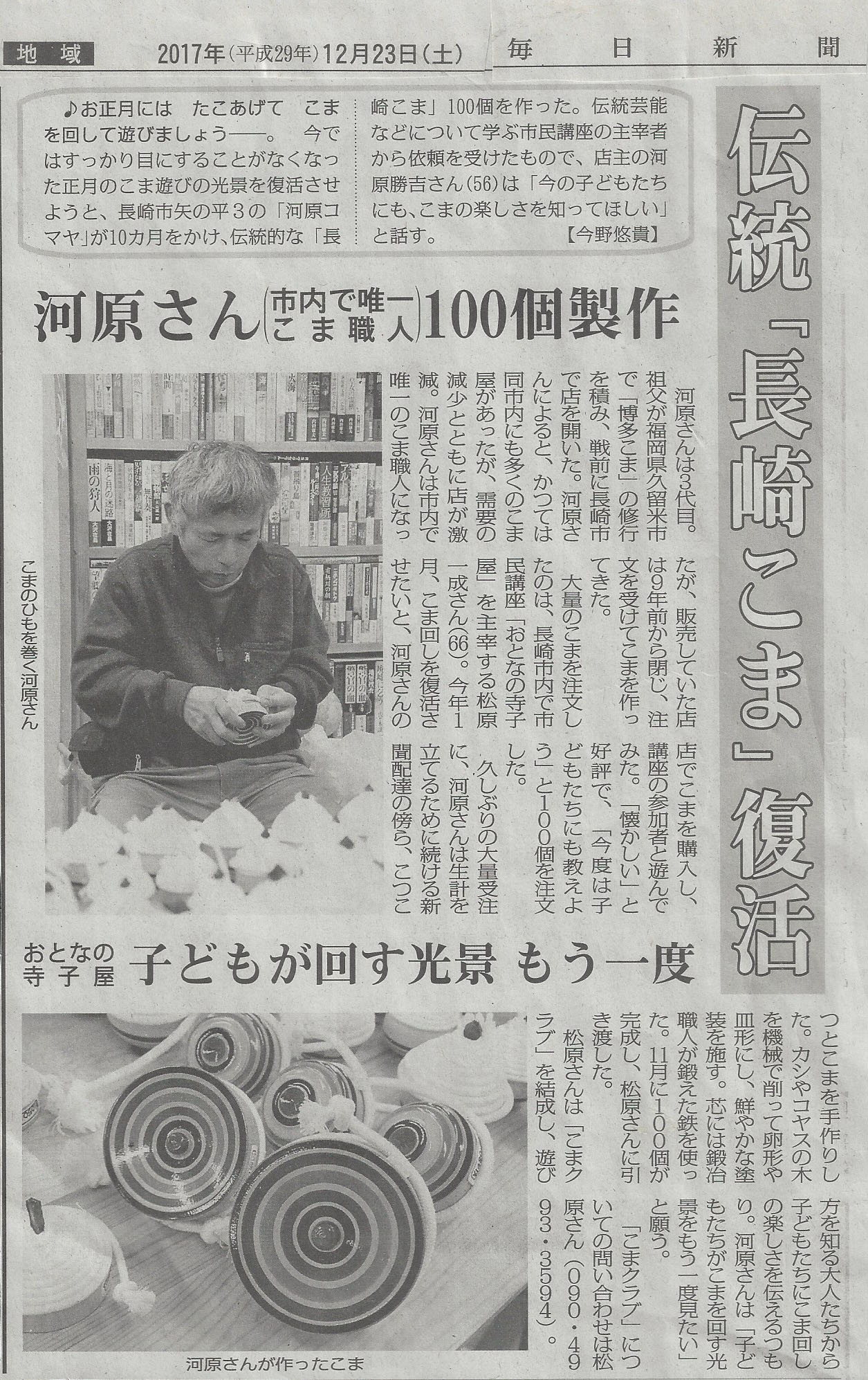 伝統「長崎こま」復活 河原さん(長崎市内で唯一のこま職人)100個製作 おとなの寺子屋 子どもが回す光景もう一度 毎日新聞 2017年12月23日 土曜日朝刊掲載 毎日新聞さん掲載ありがとうございます。