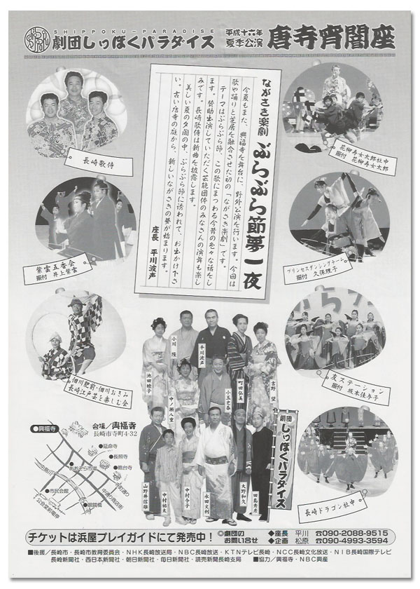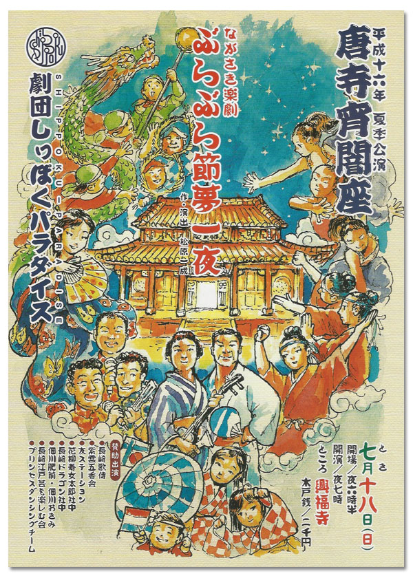 ぶらぶら節夢一夜 平成十六年夏期公演 唐寺宵闇座 ながさき楽劇「ぶらぶら節夢一夜」 作・演出 松原一成 とき 2004年7月18日 日曜日 ところ 興福寺 木戸銭 2,000円 企画・制作 劇団しっぽくパラダイス
