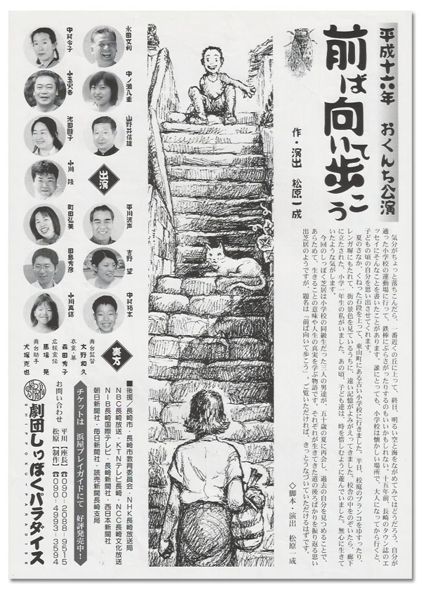 前ば向いて歩こう 平成十六年おくんち公演 「前ば向いて歩こう」 作・演出 松原一成 とき 2004年10月10日 日曜日 2004年10月11日 祝日 ところ メルカつきまち 木戸銭 2,000円 企画・制作 劇団しっぽくパラダイス