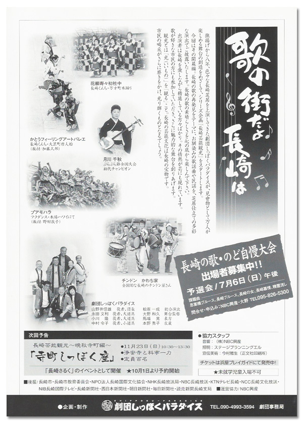 歌の街だよ長崎は 長崎芸能観光 開幕編 歌の街だよ長崎は とき 2008年7月20日 日曜日 昼の部 午後1時 夕の部 午後5時 ところ メルカつきまち 木戸銭 2,000円 企画・制作 劇団しっぽくパラダイス