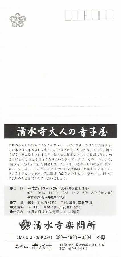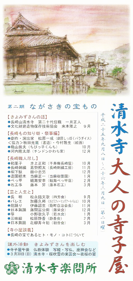 清水寺大人の寺子屋2013 清水寺大人の寺子屋 第二期 ながさきの宝もの 日 時 平成25年9月8日〜平成26年3月9日 午前9時30分〜午後0時30分 定 員 40名(男女各20名)年齢、職業、宗教不問 受講料 14,000円 ※全7回分・初回に全納 申 込 8月末日までに電話にて、先着順