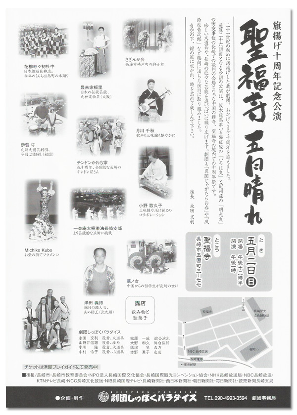 聖福寺五月晴れ 旗揚げ10周年記念公演 聖福寺五月晴れ とき 平成22年5月2日 日曜日 開場 午後12時30分 開演 午後1時〜午後4時 ところ 聖福寺 長崎市玉園町3-77 木戸銭 2,500円(前売り2,000円) 企画・制作 劇団しっぽくパラダイス