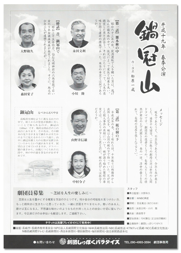 鍋冠山 平成十九年春季公演 「鍋冠山」 作・演出 松原一成 とき 2007年4月29日 日曜日 2007年4月30日 祝日 ところ メルカつきまち 木戸銭 2,000円 企画・制作 劇団しっぽくパラダイス