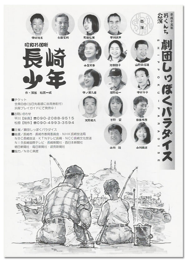 長崎少年 平成十五年おくんち公演 「長崎少年」 作・演出 松原一成 とき 2003年10月12日 日曜日 2003年10月13日 祝日 ところ メルカつきまち 木戸銭 2,000円 企画・制作 劇団しっぽくパラダイス