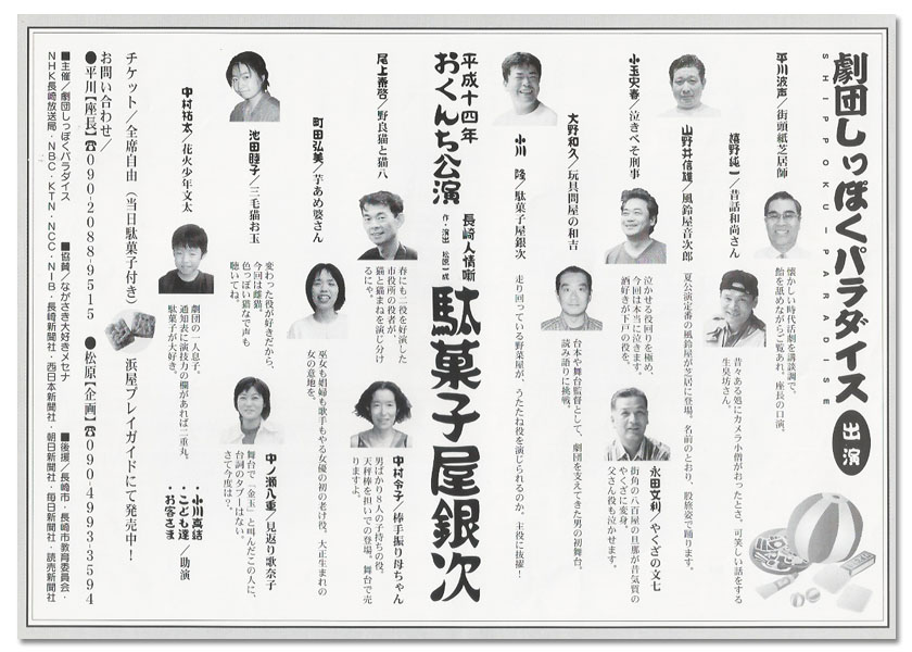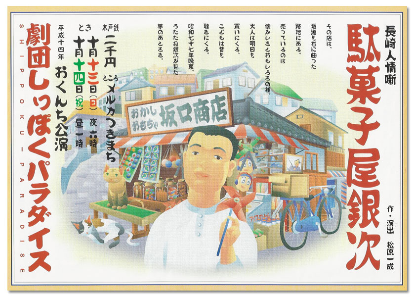駄菓子屋銀次 平成十四年おくんち公演 長崎人情噺 「駄菓子屋銀次」 作・演出 松原一成 とき 2002年10月13日 日曜日 2002年10月14日 祝日 ところ メルカつきまち 木戸銭 2,000円 企画・制作 劇団しっぽくパラダイス
